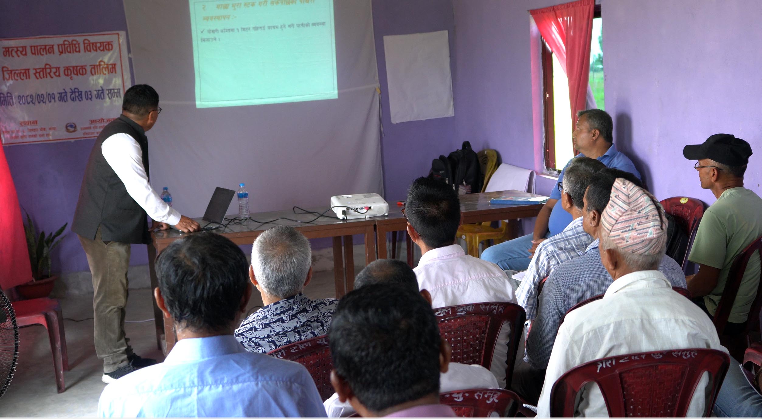 झापाको कमल गाउँपालिका वडा नंं ६ फादेन कृषि फार्ममा भएको तालिमले व्यवसायिकरुपमा माछा पालन गर्दै आएका किसानलाई कम लागतमा गुणस्तर र धेरै माछा उत्पादनबारे जैविक विधि तथा यान्त्रिकरणबारे ज्ञान प्रदान गरिएकाे तालिमका सहजकर्ता भेटरनरी अस्पताल तथा पशु विज्ञ केन्द्र विराटनगरका सहायक मत्स्य विकास अधिकृत लाक्पा भुटियाले बताउनु भयाे।