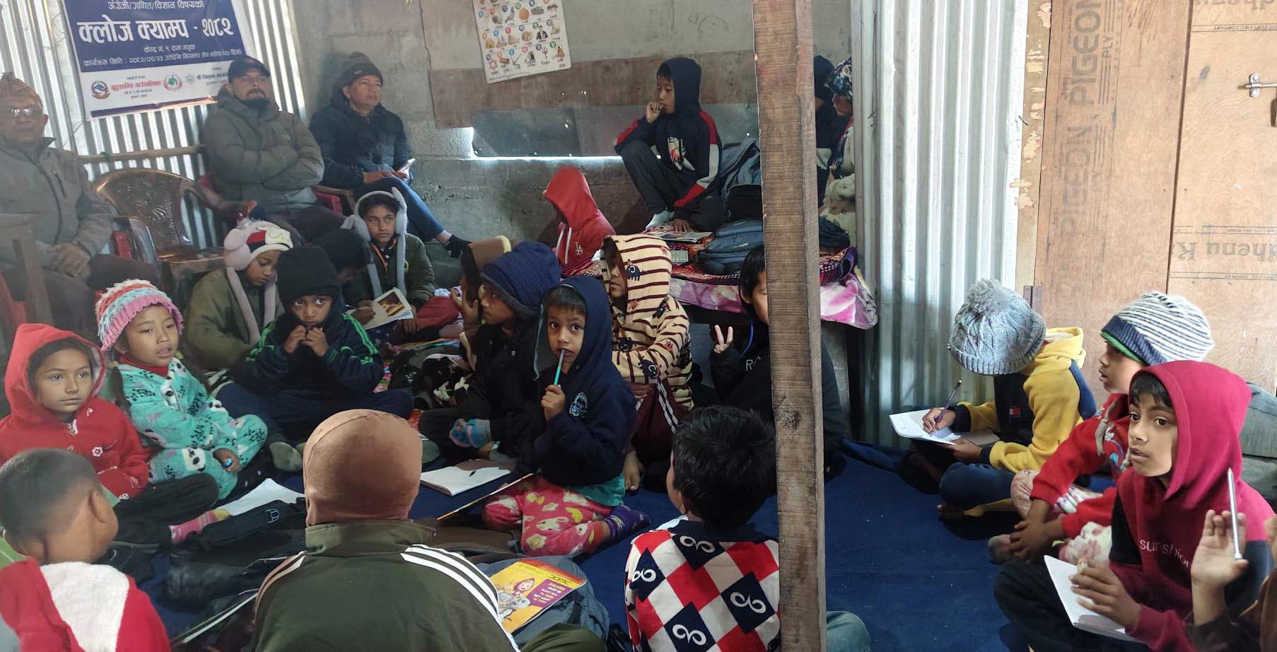 बुद्धशान्ति गाउँपालिका–१ का तीनवटा सामुदायिक विद्यालयमा विद्यार्थीको सिकाइ उपलब्धी अभिवृद्धि गर्न ९ स्थानमा ‘क्लोज क्याम्प’ कार्यक्रम सञ्चालन गरिएको छ। वडाको पहलमा सञ्चालन गरिएको उक्त क्याम्पमा विहानी सत्रमा कक्षा सञ्चालन गरी विद्यार्थीमा पढ्ने संस्कृतिको विकास गरिनेछ। विशेषगरी अङ्ग्रेजी, गणित र विज्ञान विषयमा केन्द्रित रहेर कक्षा सञ्चालन हुने वडा अध्यक्ष अनिल वाग्लेले बताउनु भयो ।